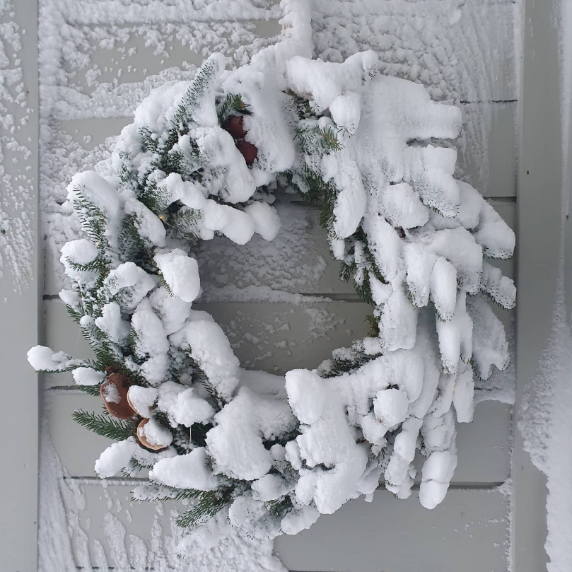 This winter wreath encapsulates January’s serene beauty. Layers of evergreen branches peek through a thick layer of fresh snow, crafting a soft, sculptural appearance that exudes tranquility, warmth, and true seasonal essence. The natural snowy effect adds depth and texture without introducing any additional color, making it ideal for neutral homes, rustic aesthetics, or minimalist winter decor. It serves as a timeless reminder that winter styling can be straightforward, natural, and beautifully elegant.
