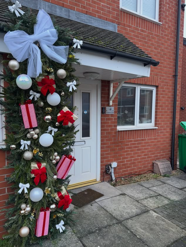 This entryway makes a striking winter impression with a plush evergreen garland adorned with oversized ornaments, ribbons, and gifts. The vertical design effortlessly captures attention and enhances the entrance’s grandeur, adding height and flair to the brick façade. A color palette of classic reds, whites, and metallics keeps the ambiance cheerful yet traditional, offering a warm welcome even during the coldest winter days.