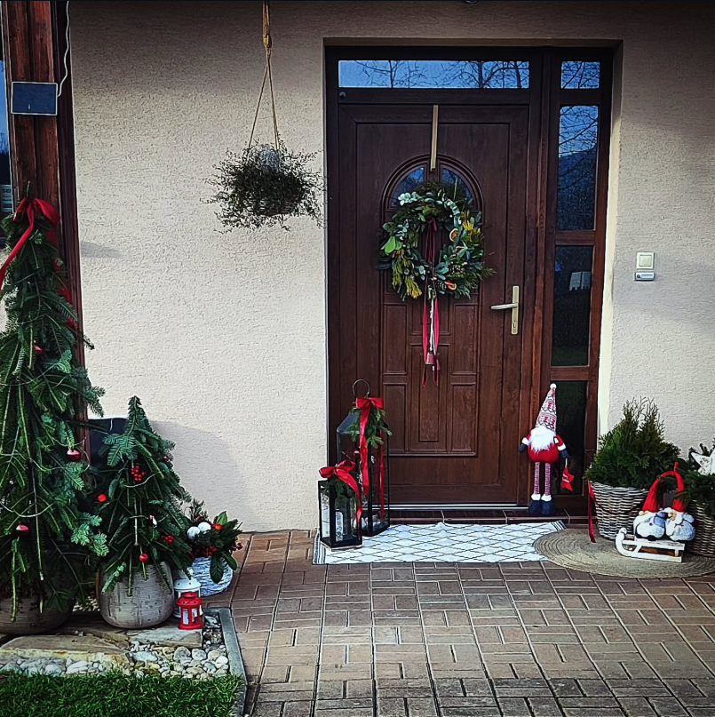 This inviting front entrance radiates a lived-in comfort, featuring a rich wooden door, a natural greenery wreath, and delicate holiday accents throughout. Lanterns, potted evergreens, and hints of red add warmth without excess, crafting a rustic yet charming aesthetic perfect for winter.
