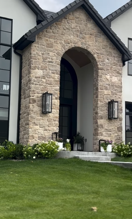This impressive stone-front entrance embraces subtle winter decoration, allowing the architectural beauty to stand out. Soft greenery, minimalistic planters, and warm lanterns create an inviting atmosphere that feels sophisticated and refined—ideal for a modern winter front door.