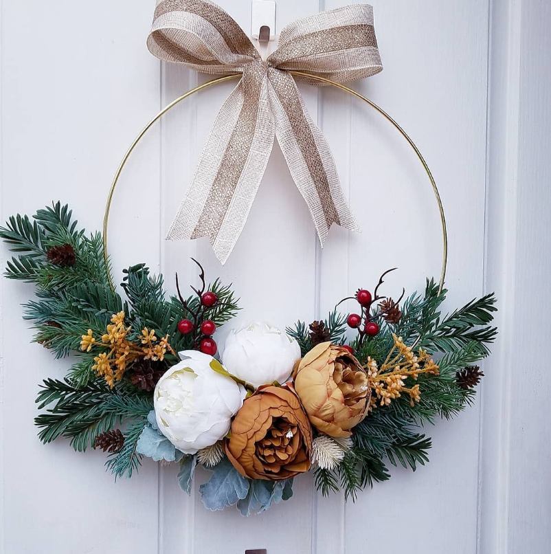This subtle hoop wreath introduces a fresh and modern flair to winter front door decor. With its muted florals, evergreen sprigs, and a simple linen bow, it conveys warmth and hospitality without excess, making it perfect for a tranquil, elegant entrance.