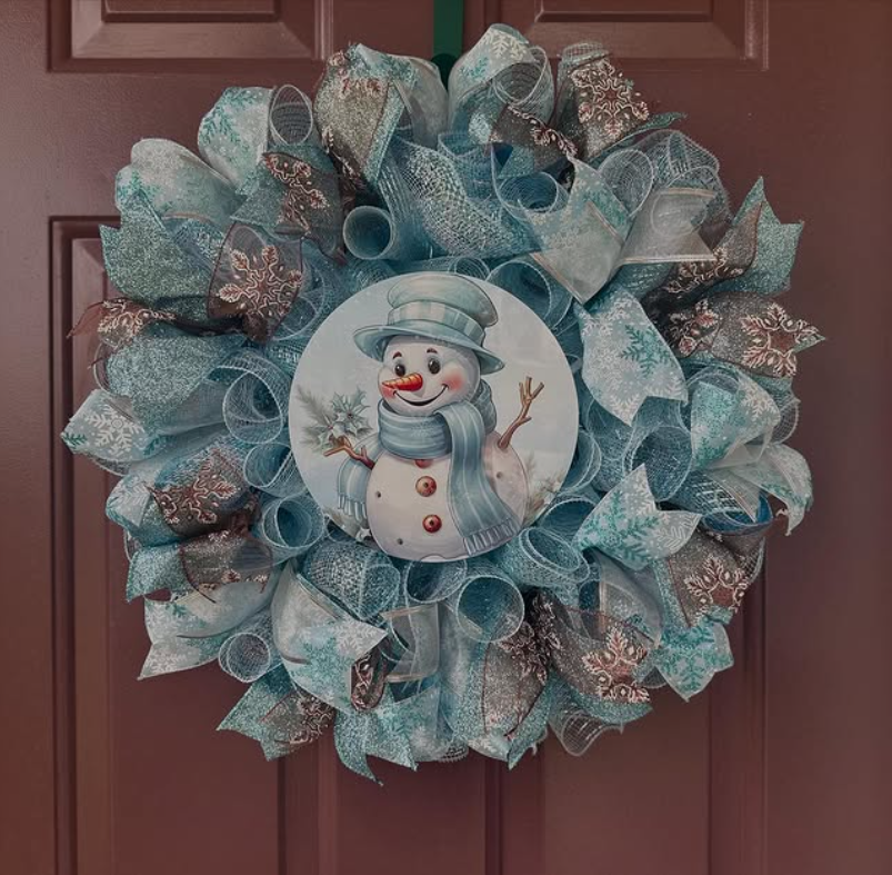 This charming winter wreath instantly adds character to your front door, featuring layered blue mesh ribbons and an adorable snowman at its center. The gentle icy hues and textured loops create a playful and cozy appearance that feels festive while remaining understated, making it a great choice for adding charm and warmth to your winter entry.