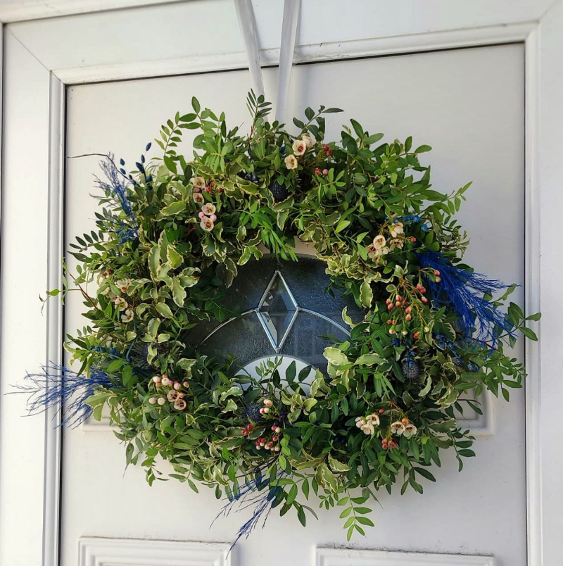 16. Fresh Greenery Wreath with Blue Accents for a Classic Look