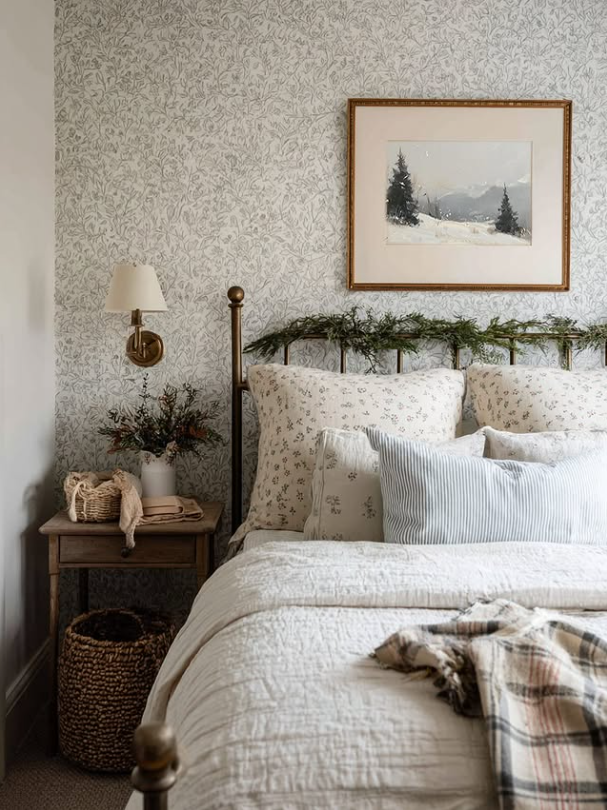This delightful winter bedroom merges soft textures, warm layers, and gentle greenery to establish a snug and appealing retreat. The floral bedding, plaid throw, and elegant wallpaper contribute to a timeless cottage ambiance, while the evergreen garland and seasonal artwork introduce a wintery flair. This setup is ideal for reimagining your bedroom into a warm and peaceful winter getaway.