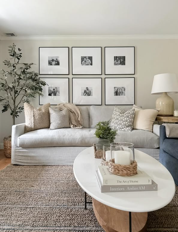 This airy and welcoming winter living room emphasizes soft neutral shades, chunky knit pillows, and a textured rug to create a cozy and serene atmosphere. The gallery wall provides a personal flair, while the woven tray, candles, and simple greenery on the coffee table infuse warm seasonal charm. It serves as an ideal example of how amalgamating textures and subtle winter elements can convert your environment into a comfy winter retreat.